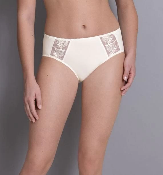 Flattering high waisted Safina Brief in soft glossy fabric with eye catching floral lace insert.