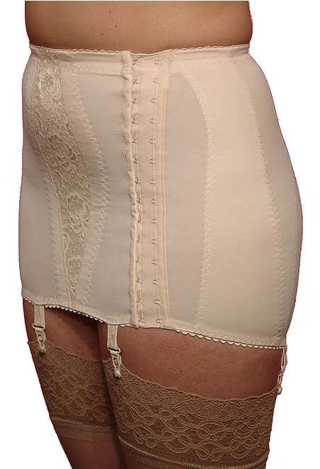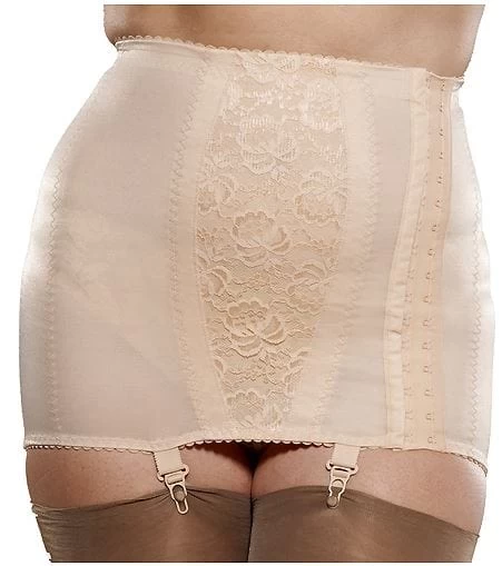 Exceptionally supportive open girdle with hook side fastening and suspenders.