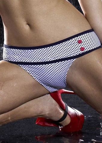 Katie Bikini briefs with a deep waistband in navy and white and pretty vivid red buttons making this brief from Panache Swimwear stand out from the rest.
