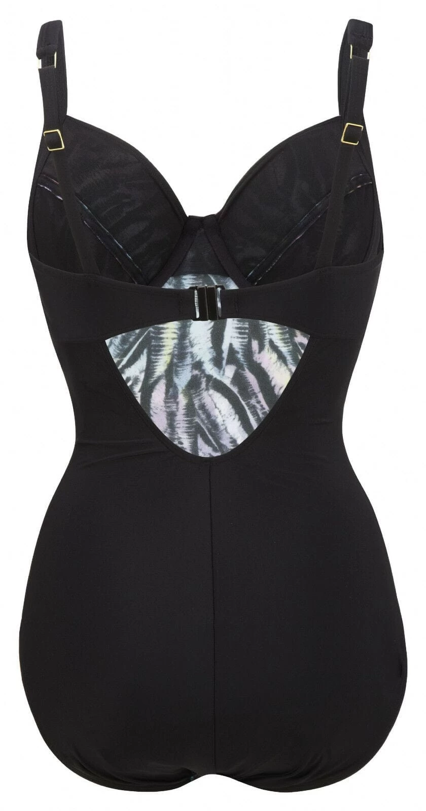 Sexy one piece swimsuit with built in bra to support and give perfect shape. With slimming black side panels and beautiful multi coloured feather print giving an exceptionally flattering look.